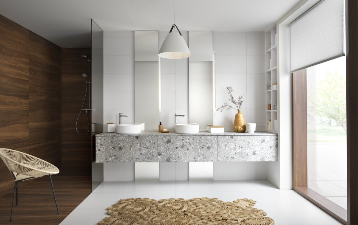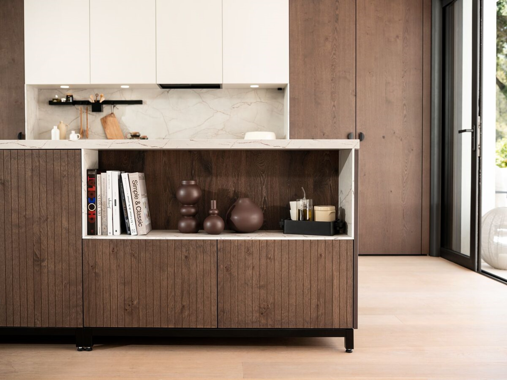 - Jouer sur les matières naturelles en mixant un bois clair aux veines apparentes avec une surface minérale ou un plan de travail en pierre claire. Cette combinaison crée un contraste doux et typique du Japandi et apporte immédiatement de la profondeur à la pièce.