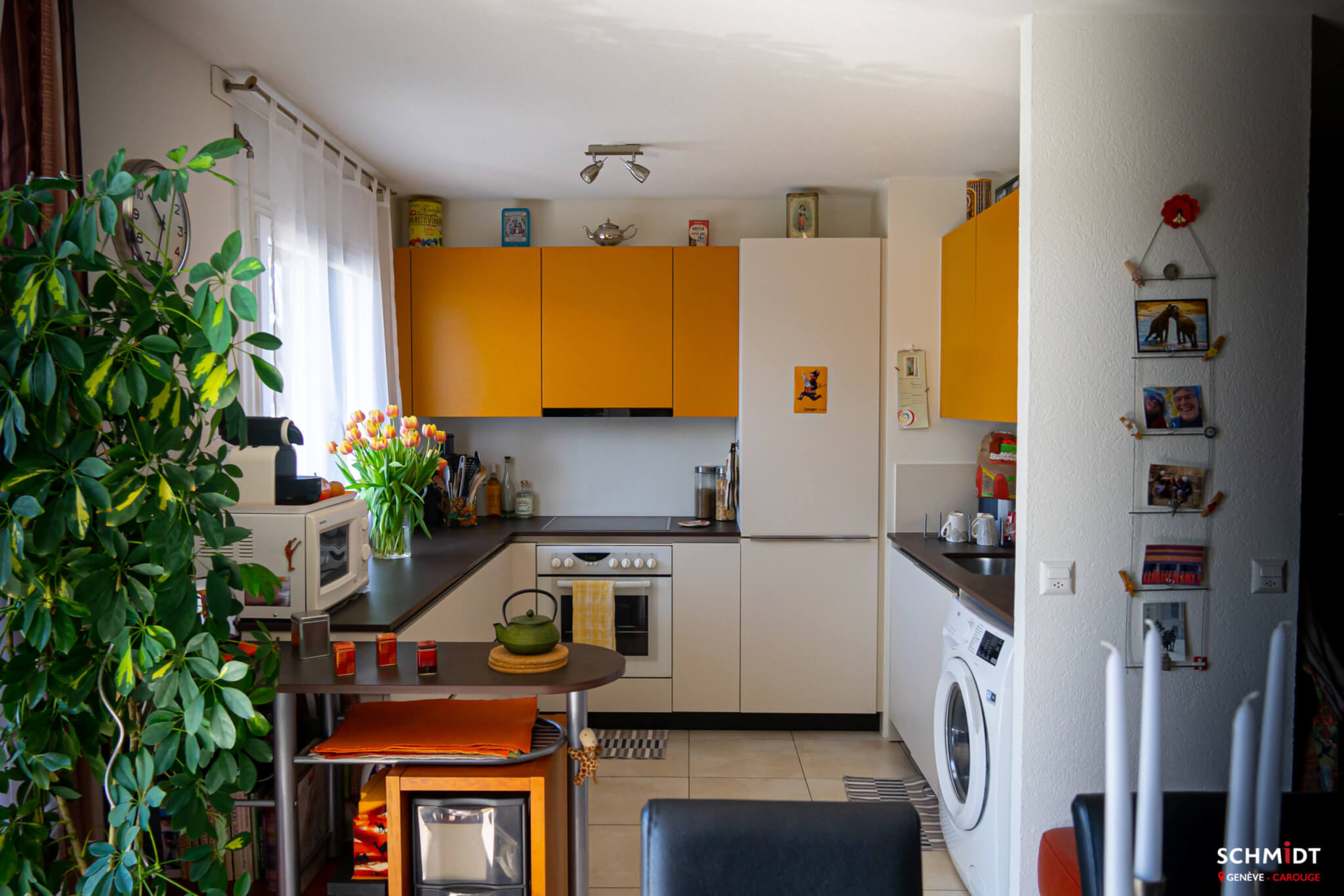 Découvrez cette belle cuisine bicolore et ouverte, située à Versoix et pleine de fantaisie ! Un color mix plus que réussi entre le jaune Madras, le Magnolia et le plan de travail Dekton Keranium au ton chocolaté.