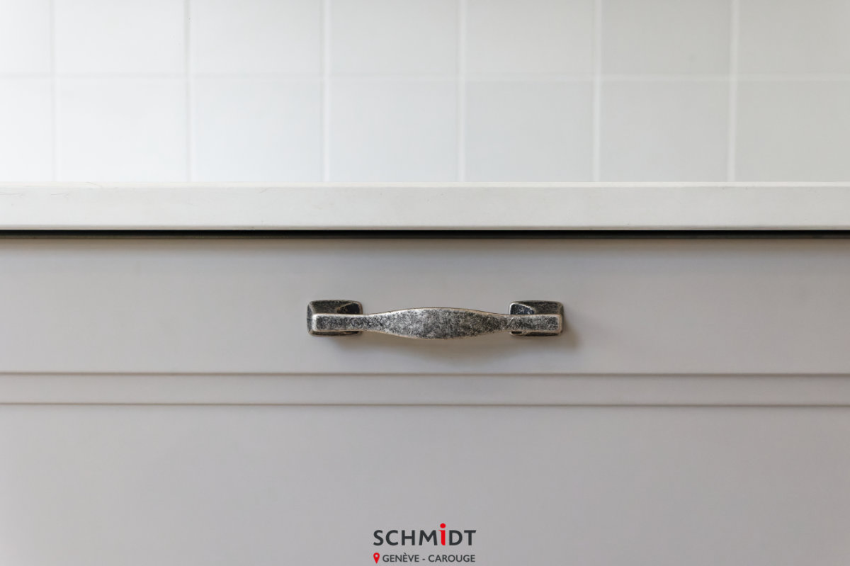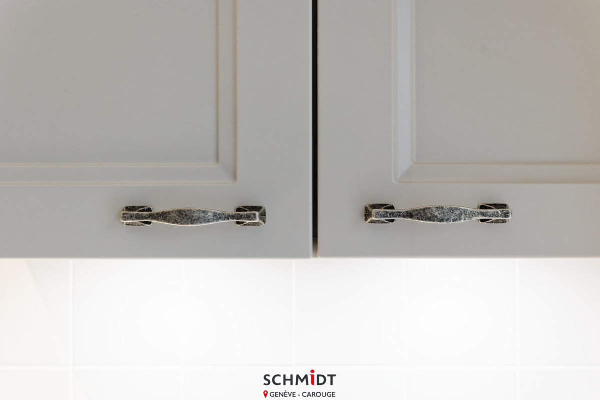 Les poignées vintage en métal patiné, à la forme légèrement arquée, renforcent cet esprit mobilier et donnent davantage de caractère à l’ensemble. Elles soulignent le choix du client d’une cuisine traditionnelle lumineuse, élégante mais dépourvue de surcharge décorative.