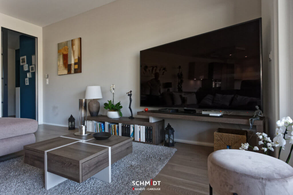 Pour la pièce à vivre, Julie, designer à Schmidt Genève Carouge, a réalisé différents aménagements, tous en accord avec les tonalités de la cuisine ouverte. En effet, le meuble TV, la commode et la table basse reprennent le coloris Vison de la cuisine mais cette fois dans sa version mate.