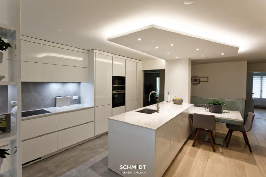 Cette cuisine blanche entièrement rénovée se situe à Thônex. Julie, designer Schmidt, a proposé une cuisine ouverte ultra fonctionnelle, design et contemporaine avec ses façades blanches brillantes et sans poignées. De plus, elle possède de nombreux rangements ainsi qu’un vaste îlot central et un espace repas pratique et convivial.